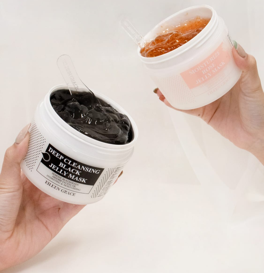 Masker jelly pertama di Indonesia, Eileen Grace menawarkan dua jenis produk masker yaitu Hydrating Rose Jelly Mask dan Deep Cleansing Black Jelly Mask dengan harga Rp. 399.000 / 300ml produk.